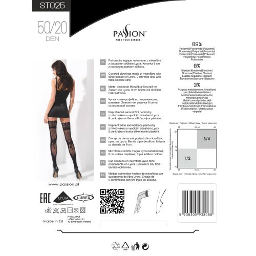На нашому сайті ви можете купити жіночі панчохи від польського бренду Passion. Ексклюзивна модель ST025 Nero виглядає неймовірно витончено і привабливо. Передня частина панчіх виконана з щільної 50 DEN матової чорної мікрофібри з високим вмістом LYCRA. Ззаду є вставки щільністю 20 DEN з малюнком у вигляді сіточки і елегантних бантиків. Особливий шарм панчохам надає металізована люрексова нитка сріблястого кольору, якою прикрашені бантики.