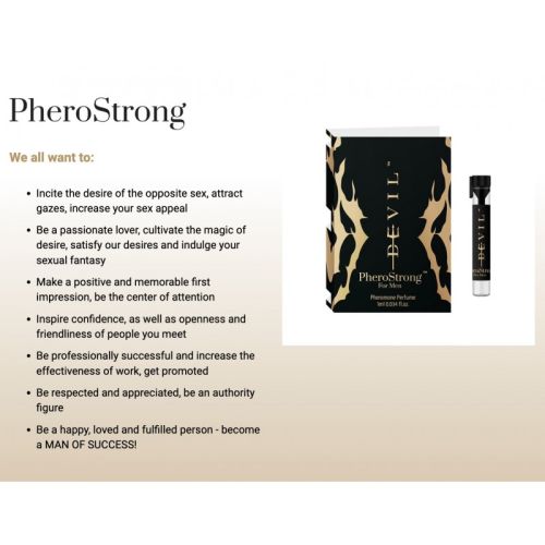 Духи із феромонами для чоловіків для збудження жінок. Розпалюйте бажання протилежної статі, привертайте погляди, підвищуйте свою сексуальну привабливість. Будь пристрасним коханцем, культивуй магію бажання, задовольняй наші бажання та віддайся своїй сексуальній фантазії. Виконайте позитивне і незабутнє перше враження, будьте в центрі уваги. Вселяйте довіру, а також відкритість і дружелюбність людей, яких ви зустрічаєте. Будь професійно успішним і підвищуй ефективність роботи, отримуй підвищення. Користуйтесь повагою та вдячністю, будьте авторитетною фігурою. Будь щасливою, коханою і людиною, що відбулася, - стань ЧОЛОВІКОМ УСПІХУ! Верхня нота: бергамот, чорний перець. Переклад: кедр, шавлія. Базова нота: боби тонка, какао, амбра. Феромон PheroStrong Devil for Men з'явився на ринку прямо з пекельних глибин, щоб доповнити жіночу композицію PheroStrong Angel. Іскри часто летять, коли протилежності притягуються. Аромат PheroStrong Devil for Men з феромонами створений для сучасних бунтарів, які люблять розсувати кордони, порушувати умовності і спокушати небезпечним поглядом. У ноті серця переплітаються акорди кедра та ароматної шавлії, аромат яких супроводжуватиме вас близько 2 годин. Базові ноти: інтенсивні боби тонка, амброва деревина та какао. Боби тонка відомі як золото Амазонки та один з найпопулярніших інгредієнтів у парфумерній промисловості. Запах цілих бобів різкіший і нагадує гіркий мигдаль чи тютюн. При подрібненні вони пахнуть нугою, білим шоколадом або горіхами з додаванням ванілі. PheroStrong - хімія кохання набуває нового сенсу. "Феромони використовуються для посилення еротичного потягу і навіть для лікування порушень сексуального потягу і збудження", - каже професор Збігнєв Лев-Старович, - і викликають: почуття бажання, закоханість, збільшують ваші шанси на оргазм. Результати досліджень, проведених з феромонами, показують, що ми можемо контролювати нашу сексуальність та пов'язану з нею поведінку. Феромони PheroStrong зроблять вас неперевершеною для протилежної статі. Вони дозволять вам зламати бар'єр сором'язливості та збільшать ваші шанси на флірт. Вони допоможуть вам бути відкритою, впевненою в собі та товариською людиною. Стати центром уваги - PheroStrong допоможе вам розвинути магнетичну індивідуальність. Ця сексуальна приманка також допоможе вам розпалити пристрасть та бажання у вашій спальні. Вони допоможуть дозволити, розкрити та відродити пристрасть. Феромони підвищують рівень збудження та знімають збентеження. Більше відкритості дасть вам обом нові інтенсивні відчуття. Феромони працюють у найрізноманітніших відносинах, наприклад, чоловік-жінка, чоловік-чоловік або жінка-жінка. Вони впливають на наші гормони, а також на альфа-ритм мозку та нейротрансмітери. Тому вони часто використовуються між людьми однієї статі у професійній сфері, на роботі, у діловому середовищі. Ви хочете покращити свої ділові відносини? Підвищити ефективність? Мати найкращу продуктивність на роботі? Виступити позитивно на співбесіді? PheroStrong може допомогти вам завоювати довіру друзів та ділових партнерів та завоювати довіру. Це також може покращити вашу стійкість до стресу, так що ви можете отримати більше впевненості та поваги з боку вашого опонента, що сидить з іншого боку столу. Феромони також можуть допомогти вам справити хороше перше враження. Вони можуть розши