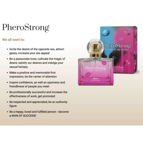 Розпалюйте бажання протилежної статі, привертайте погляди, підвищуйте свою сексуальну привабливість. Будь пристрасним коханцем, культивуй магію бажання, задовольняй наші бажання та віддайся своїй сексуальній фантазії. Виконайте позитивне і незабутнє перше враження, будьте в центрі уваги. Вселяйте довіру, а також відкритість і дружелюбність людей, яких ви зустрічаєте. Будь професійно успішним і підвищуй ефективність роботи, отримуй підвищення. Користуйтесь повагою та вдячністю, будьте авторитетною фігурою. Будь щасливою, коханою і людиною, що відбулася - стань ЧОЛОВІКОМ УСПІХУ! Верхня нота: Бергамот. Нота серця: тубероза, жасмин. Базова нота: деревина кедра, ваніль. PheroStrong pheromone HQ для неї – унікальна заява для себе та світу. Новий жіночий аромат від PheroStrong – це обіцянка незвичайної історії, створеної людьми та моментами нашого життя. Аромат ілюструє, як наші життєві подорожі – географічні чи емоційні – формують наш характер. Pheromon HQ for Her - сяюча, сучасна та жіночна парфумерна композиція на основі білих кольорів. Верхні ноти створені яскравим бергамотом Калабрії з Італії та флердоранжем з Єгипту. Переклад: індійська тубероза і жасмин. Базові ноти поєднують у собі теплу та розкішну бурбонську ваніль із Мадагаскару. Аромат – талісман, ідеальний супутник у будь-якій подорожі. Це дозволить вам згадати спогади про особливі моменти та переживання. PheroStrong pheromone HQ for her – новий жіночий аромат, створений для жінок нового покоління. Він відправить вас в ароматну навколосвітню подорож. Відкрийте свій власний шлях та розширте свій кругозір завдяки досвіду та натхненню від зустрічей з людьми. Яскрава, сучасна та жіночна парфумерна композиція на основі білих кольорів. Завжди елегантна та доглянута любителька розкішних автомобілів, відомий ютубер та інфлюєнсер. Один із власників FAME MMA. Він став популярним завдяки програмі "Варшавський берег". Хімія кохання, випущена з ароматом PheroStrong, починає чуттєву подорож у глибини нашої підсвідомості. Співають я в тебе закоханий, весь світ паморочиться. Я закоханий у тебе. Що ти зробив, що я більше не можу бути одна? Феромон у перекладі з грецької означає передавач збудження. Феромони є леткі хімічні сполуки, здатні діяти поза організмом. Ймовірно, вони є у всіх організмах: у тварин, рослин, грибів, бактерій, а також у людини. Однак феромони працюють лише між особами одного виду. Завдяки їм ми надсилаємо стимули, що позитивно впливають на спілкування з навколишнім середовищем і підвищують нашу привабливість в очах протилежної статі. На думку дослідників Віденського інституту міської етології, запахи людського тіла містять інформацію, що визначає емоційний стан людини. Коли наші нюхові рецептори вловлюють «запах» феромонів, людський розум розпізнає їх як специфічний запах, який буде викликати підсвідомі реакції у інших людей у будь-якій ситуації. роботі, на вечірці з друзями чи в гостях. офіційна зустріч. Отже, весь процес дуже ефективний, тому що він відбувається нижче свідомого рівня — нижче нашого усвідомлення — на рівні інстинктів. Реципієнт змінює свою поведінку завдяки впливу речовини, абсолютно не відчуваючи запаху феромону і не знаючи про його дію. Вважається, що якби ми не користувалися косметикою (мило, шампуні, лосьйони і т. д.), наші феромони були б більш інтенсивними. на нашу особу. Феромони в