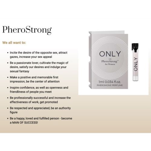 Жіночі парфуми з феромонами для збудження чоловіків. Розпалюйте бажання протилежної статі, привертайте погляди, підвищуйте свою сексуальну привабливість. Будь пристрасним коханцем, культивуй магію бажання, задовольняй наші бажання та віддайся своїй сексуальній фантазії. Виконайте позитивне і незабутнє перше враження, будьте в центрі уваги. Вселяйте довіру, а також відкритість і дружелюбність людей, яких ви зустрічаєте. Будь професійно успішним і підвищуй ефективність роботи, отримуй підвищення. Користуйтесь повагою та вдячністю, будьте авторитетною фігурою. Будь щасливою, коханою і людиною, що відбулася, - стань ЧОЛОВІКОМ УСПІХУ! Верхня нота: Жасмин, Малина. Нота серця: тубероза, боби тонка. Основна нота: ветивер. PheroStrong представляє новий аромат для жінок: pheromone Only - віддає шану найзухвалішій стороні нашої особистості. PheroStrong pheromone Only for Women - це спокусливий аромат з PheroStrong - ви просто не можете встояти перед ним. "Феромони використовуються для посилення еротичного потягу і навіть для лікування розладів статевого потягу та збудження", - каже професор Збігнєв Лев-Старович, - і причина: почуття бажання, закохаючись, збільшують свої шанси на оргазм. Результати досліджень, проведених з феромонами, показують, що ми можемо контролювати нашу сексуальність та пов'язану з нею поведінку. Феромони PheroStrong зроблять вас неперевершеною для протилежної статі. Вони дозволять вам зламати бар'єр сором'язливості та збільшать ваші шанси на флірт. Вони допоможуть вам бути відкритою, впевненою в собі та товариською людиною. Стати центром уваги - PheroStrong допоможе вам розвинути магнетичну індивідуальність. Ця сексуальна приманка також допоможе вам розпалити пристрасть та бажання у вашій спальні. Вони допоможуть дозволити, розкрити та відродити пристрасть. Феромони підвищують рівень збудження та знімають збентеження. Велика відкритість дасть вам обом нові інтенсивні відчуття. Феромони працюють у різних відносинах, наприклад, чоловік-жінка, чоловік-чоловік або жінка-жінка. Вони впливають на наші гормони, а також на альфа-ритм мозку та нейротрансмітери. Тому вони часто використовуються між людьми однієї статі у професійній сфері, на роботі, у діловому середовищі. Ви хочете покращити свої ділові відносини? Підвищити ефективність? Мати найкращу продуктивність на роботі? Покажіть себе на співбесіді позитивно? Це також може покращити вашу стійкість до стресу, так що ви можете отримати більше впевненості та поваги з боку вашого опонента, що сидить з іншого боку столу. Феромони також можуть допомогти вам справити хороше перше враження. Вони можуть розширити ваші можливості, привернути увагу, ви станете більш авторитетною людиною і, отже, більш ефективною! Свідомо керуйте своїм іміджем! PheroStrong може допомогти вам затвердити свій авторитет як керівник або менеджер і поліпшити відносини з колегами. Використовуючи феромони - інструмент, що ефективно впливає на інших людей на несвідомому рівні, - ви можете завоювати повагу та визнання, а значить, вплинути на свій професійний успіх! Феромони використовуються не тільки для спокушання. Використовуючи феромони, ми можемо покращити рівень спілкування у всіх сферах соціального життя, включаючи повсякденне життя та сімейні стосунки. Ми впливаємо на людей кожного дня. PheroStrong допоможе вам встановити справжні зв'язки з