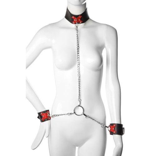 Наручники виготовлені під стиль нашийника та приєднуються ланцюжками до центрального кільця, що з'єднує три ланцюги.