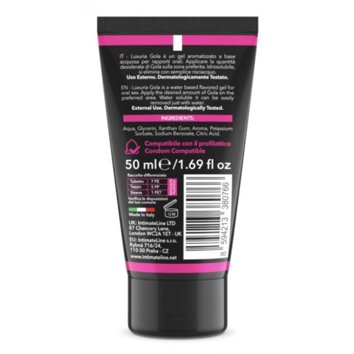 Gola Oral Pleaseure, Fragola - чудова гелева емульсія з чарівним і чуттєвим ароматом, що поєднує зволожуючу та пом'якшувальну дію цукру з відновлюючою дією натуральних фруктових екстрактів. Смачна та провокаційна, вона особливо підходить тим, хто любить смак інтимно альтернативних уподобань. Спеціально розроблена, щоб розпалити вашу уяву і додати нотку смаку у ваші найінтимніші моменти. Натуральні фруктові ароматизатори стимулюють свіжі фантазії та додають нотку смаку у ваші найінтимніші моменти. Лубриканти на водній основі – це інтимні лубриканти, які можна спеціально використовувати для зменшення тертя під час сексу. Вони рекомендуються як для вагінального, так і для анального сексу відповідно до їх особливої формули. Вони гарантують тривалий та комфортний ефект мастила. Їх також можна наносити на всі секс-іграшки. Мастило на водній основі не залишає жирності або плям і легко змивається завдяки своїй нейтральній формулі, що не містить жирів або подразнюючих речовин. Мастило на водній основі безпечне для використання з презервативами під час вагінального або анального сексу, допомагаючи вам залишатися захищеними від усіх захворювань, що передаються статевим шляхом, якими можна заразитися під час незахищеного сексу. Як використовувати? Нанесіть бажану кількість Luxuria Gola на область, яку ви хочете змастити, та помасажуйте. Склад: вода, гліцерин, ксантанова камедь, парфум (ароматизатор), бензоат натрію, сорбат калію, лимонна кислота, бензиловий спирт. Чи підходить Luxuria Gola Oral Pleasure для орального сексу? Luxuria Gola Oral Pleasure - це їстівне мастило на водній основі, спеціально розроблене для орального сексу. Продукт складається з натуральних їстівних інгредієнтів на основі фруктів, тому його можна сміливо смакувати під час інтимних зустрічей. Існують два види любрикантів. Це мастила на водній та силіконовій основах. Мастило на водній основі є універсальним та унікальним. До складу цих препаратів входять лише якісні складові, які є абсолютно безпечними для Вашого здоров'я. Також мастила бувають з різними наповнювачами та ароматизаторами. Інший вид любриканта - це мастило на силіконовій основі. Вони набирають великої популярності. Вони універсальні та використовуються при всіх видах сексу, а також з інтимними іграшками. Цей вид допомагає жінкам, у яких недостатня кількість природного мастила. Мастило на силіконовій основі має загоюючий ефект. Вибирайте мастило виходячи з Вашої мети та переваг. IntimateLine Sensual Cosmetics® народилася і вперше була розроблена в Римі, Італія, в 1998 році. З роками вона поступово зарекомендувала себе як провідна компанія в секторі інтимного догляду та благополуччя, і з того часу почала розповсюджувати свою власну лінію ексклюзивних продуктів по всьому світу. Італія. З 1998 року компанія значно розширила власний асортимент продукції. На додаток до асортименту інтимних мастил (на водній, масляній та силіконовій основі) компанія представила ряд підсилювачів сексуальності (для нього і для неї) та ряд есенцій-афродизіаків, що перетворюють інтимні контакти на все більш унікальні переживання. З того часу компанія перенесла свою адміністративну штаб-квартиру в Лондон, столицю Великобританії та будинок Modern LifeStyle, але її виробничий майданчик залишився в Італії і продовжує працювати відповідно до найсуворіших стандартів якості, що орга