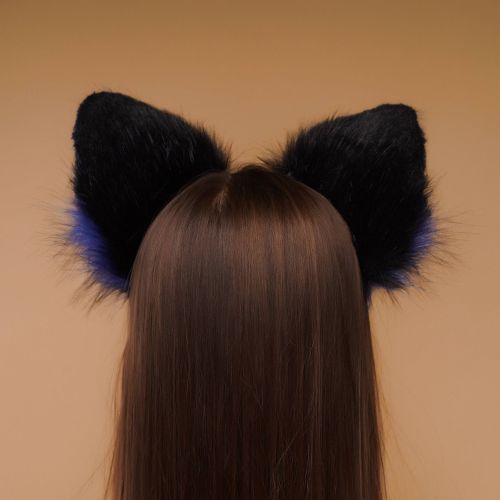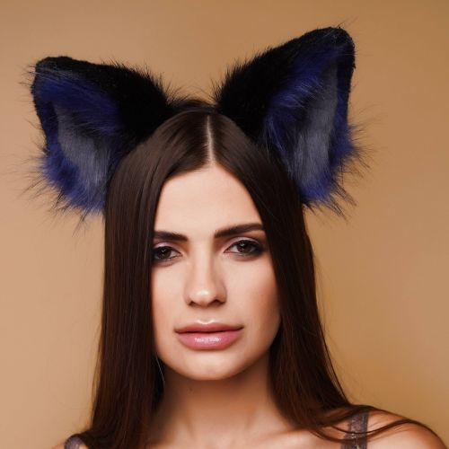 Хутряні вушка кішечки триколірні для рольових ігор Чорний Синій Сірий Okova
