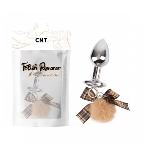 Анальна пробка з медичної сталі з камінцем сріблястого кольору та тілесним бантиком Cnt Fluffy Bow