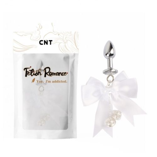 Анальний корок із медичної сталі з камінчиком сріблястого кольору з білим бантиком Cnt