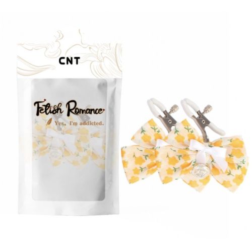 Затискачі для сосків БДСМ з силіконовими наконечниками, білими бантиками та жовтим візерунком Cnt
