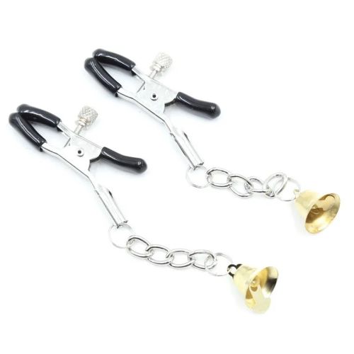 Затискачі на соски з золотистими дзвіночками БДСМ металеві з силіконовими наконечниками Vscnovelty