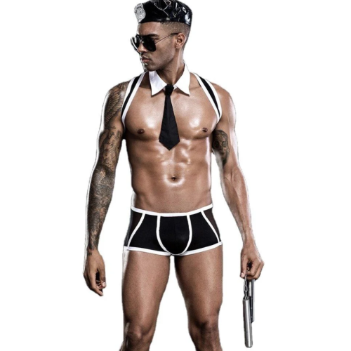 Еротичний чоловічий костюм для рольової гри гарячий поліцейський чорно-білого кольору JSY розмір S/M
