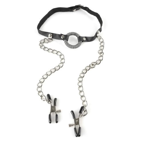 Кляп-кільце в рот із затискачами для сосків чорно-сріблястого кольору Pipedream Fetish Fantasy Series