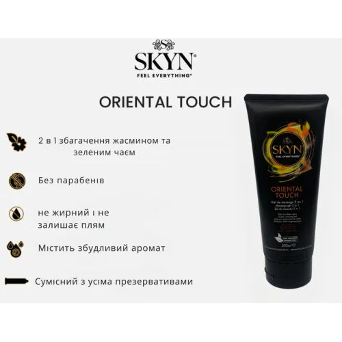 Skyn Oriental Touch – ультраніжний масажний гель 2-в-1 з чарівним ароматом жасмину та зеленого чаю. Формула на водній основі робить його універсальним продуктом, який можна використовувати на всіх ділянках тіла, включаючи найінтимніші.