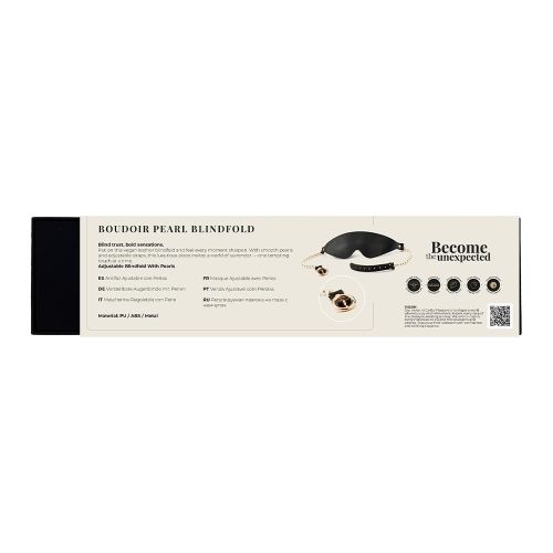 Boudoir Pearl Blindfold – розкішний аксесуар для сенсорних ігор, що поєднує естетичну вишуканість із функціональністю. Маска забезпечує повне затемнення, посилюючи відчуття дотику та очікування. Основна частина виготовлена з гладкого матового матеріалу, який комфортно прилягає до обличчя та ефективно блокує світло. Декоративна нитка із штучних перлин надає аксесуару елегантності, а регульований ремінець із веганської шкіри із золотистою фурнітурою гарантує надійну та зручну посадку.