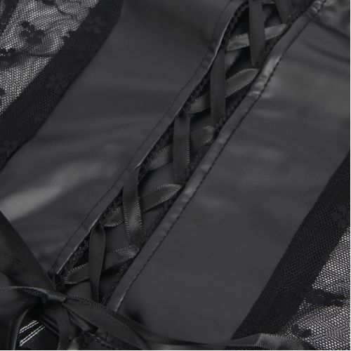 Імітація шкіри та мереживна сітка з боків підкреслюють талію та створюють контрастний дизайн.