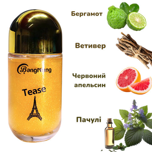 Зануртеся в атмосферу непередаваного чарівництва з чоловічими парфумами BangNeng Tease. Це не просто аромат, це - потужний інструмент спокуси та впевненості. Сексуально-привабливий запах, збагачений феромонами, посилює ваше природне чарівництво, а золотий шиммер залишає на шкірі вишукане сяйво. Цей аромат створить навколо вас ауру привабливості та загадки, яка буде манити оточуючих протягом усього дня. Подаруйте собі відчуття особливої привабливості з BangNeng Tease!
