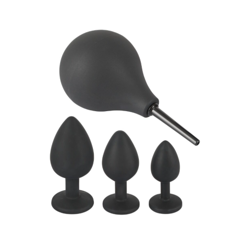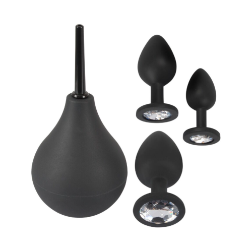 Тріо душ та пробки для анального задоволення! 4 високоякісні іграшки в одній коробці: 1 анальний душ для підготовчого прибирання та чудових відчуттів при цівку. 16,6 см заввишки, довжина введення 5,5 см, насадка шприцева Ø 0,7 - 0,9 см, об'єм наповнення 224 мл. 3 анальні пробки різних розмірів для ідеального тренування розтягування та кожна з дорогоцінним камінням біля основи для захоплюючого виду в задній кімнаті. Розміри: Невелика загальна довжина 7 см, довжина вставки 6 см, Ø макс. 2,7 см, 25 г тяжкий. Medium Загальна довжина 8 см, довжина вставки 7 см, Ø макс. 3,5 см, вага 44 гр. Загальна довжина 9,5 см, довжина вставки 8,5 см, Ø макс. 4,2 см, вага 75 гр. Силікон, ПУ, АБС, акрил.