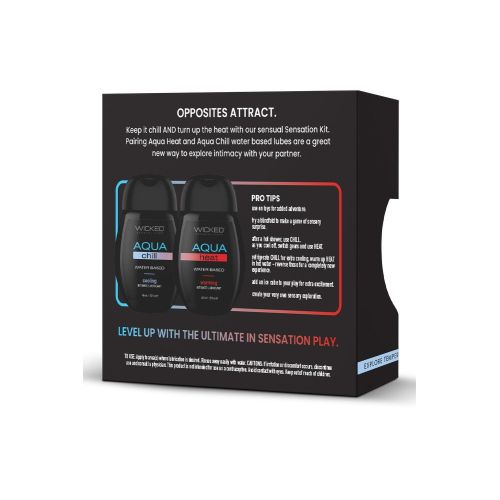 Wicked Sensation Kit Chill And Heat – набір лубрикантів, створений для комбінованого ефекту охолодження та зігрівання. Aqua Chill дарує приємне охолодження, а Aqua Heat – теплі відчуття, що дозволяє по-новому досліджувати інтимність та сенсорні відчуття разом із партнером.