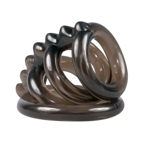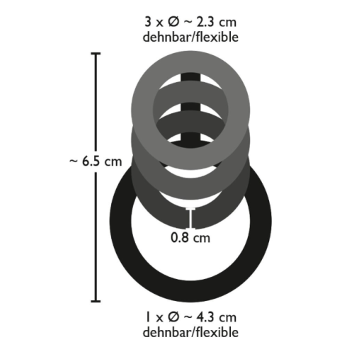 3 кільця для пеніса в поєднанні з кільцем для яєчок Ріфлена сполучна планка Розтягується - ідеально підходить Підтримує ерекцію Додаткова стимуляція під час сексу М'який шовковистий TPE Посилює ерекцію та стимуляцію! Кільце для члена від Bad Kitty поєднує в собі кільце для яєчок та 3 кільця для члена з ребристою сполучною перемичкою. Тріо кілець для члена, що щільно облягає і підтримує ерекцію, просто надягається, а кільце для яєчок забезпечує щільне прилягання і збуджуючий натяг. М'яка ребристість сполучної планки забезпечує додаткову збуджуючу стимуляцію під час сексу. Приємний для шкіри м'який, шовковистий матеріал, що тягнеться (TPE) чудово адаптується до пеніса і яєчок, а також до рухів. Загальна довжина 6,5 див. Товщина кілець 8 мм кожне. Кільця Ø 3 x 2,3 см та 1 x 4,3 см. TPE.