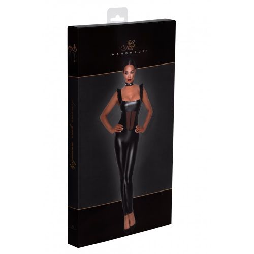 Комбінезон – ідеальний варіант одягу для тих, хто хоче гідно продемонструвати фігуру під час сексу з партнером та обдурити його розкішним фетиш-образом. Дана модель має кокетливі декоративні елементи у вигляді рюшів на бретелях, тому якщо ви хочете створити BDSM-look, то він вийде кокетливішим і грайливішим у цьому комбінезоні. Груди виглядають натурально та сексуально завдяки широкому декольту та відсутності ущільнених чашок. Під бюстом розташована сітчаста вставка, яка візуально звужує силует, роблячи його жіночнішим і надаючи фігурі форму піщаного годинника. Якісний вініл щільно прилягає до тіла, облягаючи округлості та вигини, серед яких найбільш привабливо виглядають стегна та сідниці. Руки залишаються відкритими, проте ви можете купити рукавички Noir Handmade, щоб образ був ще більш гармонійним та збалансованим. Якщо ви все ще роздумуєте варто купити комбінезон від Noir Handmade, то впевнені, що наявність блискавки для інтимного доступу зможе вас переконати, тому що з її допомогою ви зможете займатися сексом не витрачаючи години на роздягання. У комбінації з рештою переваг комбінезон стане перлиною вашого гардеробу. Правила догляду за одягом Noir Handmade: Рекомендуємо прати вручну, використовуючи рідкі засоби для очищення одягу. Для прання в машинці необхідно встановити ручну або делікатну програму. Перед першим використанням видаліть одяг, щоб уникнути зміни кольору. Щоб одяг зберіг потрібну форму, його слід сушити на тремпелі. Не використовуйте сушильну машину. Характеристики: Розмір – L Матеріал – вініл