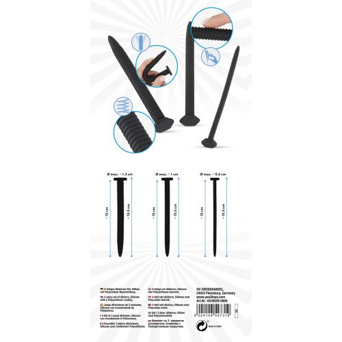 3 дуже довгих розширювача в захоплюючій гвинтовій оптиці та з різними діаметрами та різною вагою. Ідеально підходить для початківців та фахівців з дилатації уретри. Стимулюючі канавки інтенсивно стимулюють уретру, а пробка запобігає надто глибокому проникненню.