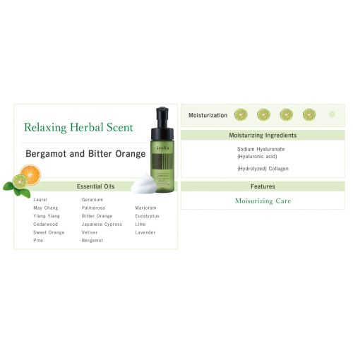 Ingredients: Water, Dipropylene Glycol, Tea-Cocoyl Glutamate, Pentylene Glycol, Lauryl Betaine, Cocamide DEA, Polyglyceryl-10 Laurate, Caprylyl Glycol, Arginine, Sodium Citrate, Caprylhydroxamic Acid, Glycerin, Tetra Cubeba Fruit Oil, Cananga Odorata (Ylang Ylang) Flower Oil, Juniperus Virginiana Oil, Citrus Aurantium Dulcis (Orange) Peel Oil, Turpentine, Pelargonium Graveolens Oil, Cymbopogon Martini Oil, Citrus Aurantium Amara (Bit Obtusa Oil, Vetiveria Zizanoides Root Oil, Citrus Aurantium Bergamia (Bergamot) Fruit Oil, Origanum Majorana Leaf Oil, Eucalyptus Globulus Leaf Oil, Citrus Junos Peel Oil, Citrus Aurantifolia (Lime) Oil, Lavandula Extract, Vitis Vinifera (Grape) Fruit Extract, Butylene Glycol, Morus Bombycis Root Extract, Scutellaria Baicalensis Extract, Disodium EDTA, Calendula Officinalis Flower Extract, Sodium Hyaluronate, Hydrolyzed Collagen, Phenoxyethanol