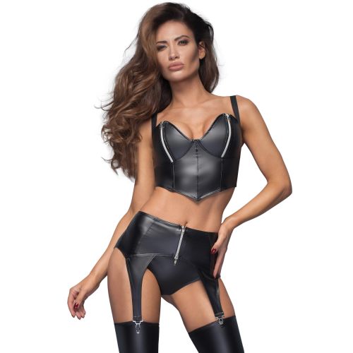 До пояса прикріплені регульовані пажі на резиночках, які відмінно утримуватимуть панчохи. Завершіть образ відповідними сексуальними панчохами та вініловим топом.