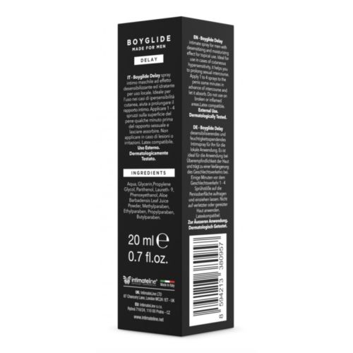 Boyglide Delay Spray – це інтимний спрей-затримка для чоловіків з десенсибілізуючим та зволожуючим ефектом для місцевого застосування. Ідеально підходить для випадків гіперчутливості шкіри, допомагає значно продовжити інтимні контакти. Десенсибілізуючий ефект Boyglide Delay дозволяє відчувати більш тривалі сексуальні контакти у випадках гіперчутливості шкіри. Його швидкодіюча формула означає, що ви можете нанести його за кілька хвилин до інтимної близькості і все одно насолоджуватися його ефектом. Boyglide Delay безпечний для використання з презервативами під час вагінального або анального сексу, допомагаючи вам залишатися захищеними від усіх захворювань, що передаються статевим шляхом, якими можна заразитися під час незахищеного сексу. Як використовувати? Нанесіть від 1 до 4 розпилення Boyglide Delay на головку статевого члена за кілька хвилин до сексу і дайте йому вбратися. Склад: вода, гліцерин, пропіленгліколь, лаурет-9, феноксиетанол, пантенол, етилгексилгліцерин, порошок соку листя алое вера. Пролонгатори сексу - це продукти або препарати, які призначені для збільшення тривалості статевого акту. Вони можуть використовуватися чоловіками з метою затримки еякуляції та покращення контролю над сексуальною функцією. Однак важливо відзначити, що пролонгатори сексу не є лікарськими препаратами, а скоріше засобами тимчасового впливу, які призначені для збільшення витривалості та відстрочки оргазму. Деякі з них містять локальні анестетики, які можуть тимчасово знизити чутливість статевого члена, що допомагає збільшити тривалість статевого акту. З роками вона поступово зарекомендувала себе як провідна компанія в секторі інтимного догляду та благополуччя, і з того часу почала розповсюджувати свою власну лінію ексклюзивних продуктів по всьому світу. Італія. З 1998 року компанія значно розширила власний асортимент продукції. На додаток до асортименту інтимних мастил (на водній, масляній та силіконовій основі) компанія представила ряд підсилювачів сексуальності (для нього і для неї) та ряд есенцій-афродизіаків, що перетворюють інтимні контакти на все більш унікальні переживання. З того часу компанія перенесла свою адміністративну штаб-квартиру в Лондон, столицю Великобританії та будинок Modern LifeStyle, але її виробничий майданчик залишився в Італії і продовжує працювати відповідно до найсуворіших стандартів якості, що органічно поєднуються з усією пристрастю та оригінальністю. те, що зроблено в Італії. Всі продукти IntimateLine з лінійки Sensual Cosmetics пройшли дерматологічні випробування, гіпоалергенні та строго розроблені відповідно до норм CE та стандартів IFRA. Про них регулярно повідомляється Міністерство охорони здоров'я і вони повністю відповідають усім законам Європейського Союзу. Вся продукція виробляється на нашому заводі в Італії, де ми продовжуємо застосовувати всі найкращі стандарти якості при виборі інгредієнтів та неактивних речовин, не ставлячи під загрозу пристрасть та оригінальність виробництва в Італії. Це дозволяє нам пропонувати чудовий та ексклюзивний асортимент продукції, що підходить для всіх сценаріїв, для кожної пари та будь-якої фантазії. IntimateLine Sensual Cosmetics розпочинала свою діяльність як компанія з виробництва високоякісних інтимних мастил. З того часу він диверсифікувався і розділився за основними інгредієнтами. Її продукц
