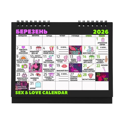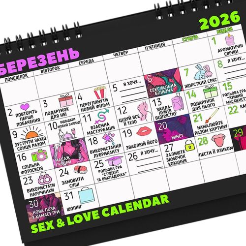 Не пропустіть шанс зробити інтимне життя яскравішим! SEX КАЛЕНДАР - це можливість додати родзинку щодня всього року. День за днем, місяць за місяцем ви будете все ближче впізнавати один одного і насолодитеся безліччю еротичних експериментів. У СЕКС КАЛЕНДАРІ-2026 ви знайдете цікаву ідею на кожен день. Це може бути і романтичне побачення, і масаж інтимних частин тіла, і рольові ігри, і перегляд фільмів для дорослих. Завдяки календарю ви зможете спробувати нові сексуальні ігри та визначитися з коханими.