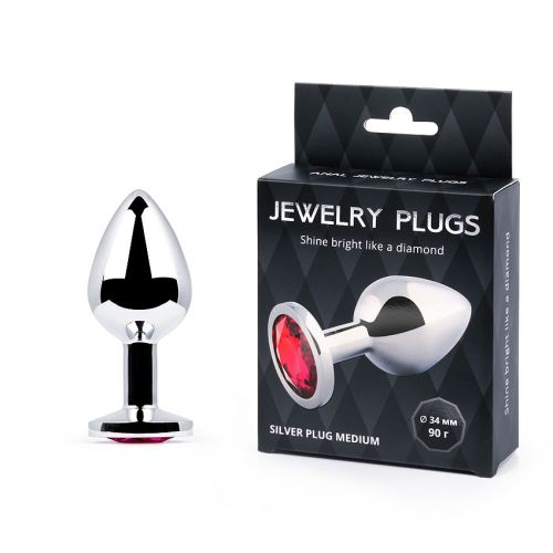 Срібляста анальна пробка з металу Anal Jewelry Plug з рубіновим кристалом L 82 мм D 34 мм вага 90 г