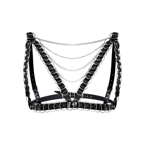 Портупея жіноча на груди з натуральної шкіри прикрашена кільцями чорного кольору Art of Sex розмір L-2XL