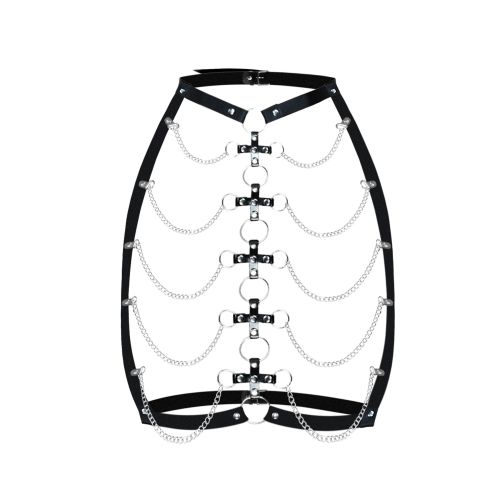 Шкіряна портупея має регульовані ремені, щоб створити ідеальну комфортну посадку по фігурі і підкреслити красу тіла та акцентувати увагу на ваших формах. Металеві ланцюжки, які прикрашають цю портупею, додають елемент екстравагантності та створюють загадковий образ, який вигідно виділяє вашу жіночність та сексуальність.