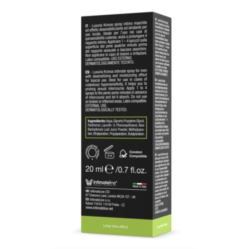 Kronos Delay Spray – це чоловічий спрей-уповільнювач з десенсибілізуючим та зволожуючим ефектом для місцевого застосування, спеціально розроблений для зовнішнього нанесення на головку статевого члена. Десенсибілізуючий ефект Kronos Delay Spray дозволяє відчувати більш тривалі сексуальні контакти у випадках гіперчутливості шкіри. Його швидкодіюча формула означає, що ви можете наносити його за кілька хвилин до інтимної близькості і все одно насолоджуватися його ефектом. Kronos Delay Spray зволожує шкіру завдяки своєму натуральному екстракту алое віра, захищаючи від подразнення або травм та забезпечуючи максимальний комфорт та задоволення під час інтимних контактів. Kronos Delay Spray безпечний для використання з презервативами під час вагінального або анального сексу, допомагаючи вам залишатися захищеними від усіх захворювань, що передаються статевим шляхом, якими можна заразитися під час незахищеного сексу. Як використовувати? Нанесіть від 1 до 4 розпилень Kronos Delay Spray на головку статевого члена за кілька хвилин до сексу і дайте йому вбратися. Склад: вода, гліцерин, пропіленгліколь, лаурет-9, феноксиетанол, пантенол, етилгексилгліцерин, порошок соку листя алое вера. Пролонгатори сексу - це продукти або препарати, які призначені для збільшення тривалості статевого акту. Вони можуть використовуватися чоловіками з метою затримки еякуляції та покращення контролю над сексуальною функцією. Однак важливо відзначити, що пролонгатори сексу не є лікарськими препаратами, а скоріше засобами тимчасового впливу, які призначені для збільшення витривалості та відстрочки оргазму. Деякі з них містять локальні анестетики, які можуть тимчасово знизити чутливість статевого члена, що допомагає збільшити тривалість статевого акту. З роками вона поступово зарекомендувала себе як провідна компанія в секторі інтимного догляду та благополуччя, і з того часу почала розповсюджувати свою власну лінію ексклюзивних продуктів по всьому світу. Італія. З 1998 року компанія значно розширила власний асортимент продукції. На додаток до асортименту інтимних мастил (на водній, масляній та силіконовій основі) компанія представила ряд підсилювачів сексуальності (для нього і для неї) та ряд есенцій-афродизіаків, що перетворюють інтимні контакти на все більш унікальні переживання. З того часу компанія перенесла свою адміністративну штаб-квартиру в Лондон, столицю Великобританії та будинок Modern LifeStyle, але її виробничий майданчик залишився в Італії і продовжує працювати відповідно до найсуворіших стандартів якості, що органічно поєднуються з усією пристрастю та оригінальністю. те, що зроблено в Італії. Всі продукти IntimateLine з лінійки Sensual Cosmetics пройшли дерматологічні випробування, гіпоалергенні та строго розроблені відповідно до норм CE та стандартів IFRA. Про них регулярно повідомляється Міністерство охорони здоров'я і вони повністю відповідають усім законам Європейського Союзу. Вся продукція виробляється на нашому заводі в Італії, де ми продовжуємо застосовувати всі найкращі стандарти якості при виборі інгредієнтів та неактивних речовин, не ставлячи під загрозу пристрасть та оригінальність виробництва в Італії. Це дозволяє нам пропонувати чудовий та ексклюзивний асортимент продукції, що підходить для всіх сценаріїв, для кожної пари та будь-якої фантазії. IntimateLine Sensual Cosmetics розпоч