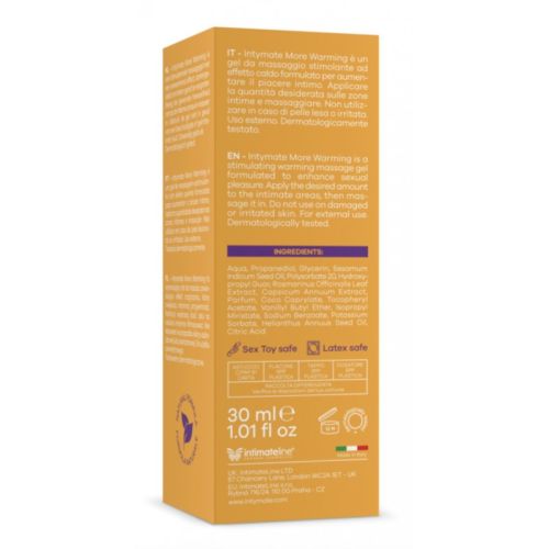 Intymate – More Warming, 30 мл – це стимулюючий масажний гель на водній основі з гарячим ефектом. Його повністю натуральна формула допоможе збільшити інтимне задоволення та покращити чутливість інтимних частин тіла. Після нанесення він забезпечить лоскоче відчуття тепла, посилюючи стимуляцію і посилюючи оргазми. Завдяки своїй спеціальній формулі More Warming збільшує приплив крові, стимулюючи жіночі ерогенні зони для підвищення чутливості. Цей гель підходить всім жінкам, які бажають випробувати підвищене сексуальне задоволення. More Warming діє, стимулюючи приплив крові до клітора та вагінальної області. При нанесенні на клітор і піхву він справляє лоскочучий і зігріваючий ефект, який підвищує чутливість, що призводить до більш інтенсивних оргазм. More Warming і More Cooling не містять агресивних для шкіри інгредієнтів. До їх складу входять тільки натуральні інгредієнти найвищої якості, які не завдають шкоди здоров'ю організму, зберігаючи при цьому дуже сильні змащувальні властивості. Нанесіть невелику кількість More Warming на область, яку ви хочете змастити, та помасажуйте. Склад: вода, пропандіол, гліцерин, олія насіння кунжуту (Sesamum Indicum), полісорбат-20, гідроксипропілгуар, ізопропілміристат, екстракт листя розмарину лікарського, бензоат натрію, токоферолу ацетат, парфум (ароматизатор), сорбат калію соняшнику (Helianthus Annuus), екстракт плодів перцю перцю (Capsicum Annuum), ванілілбутиловий ефір, евгенол, лимонен, циннамал. Оргазм - це фізіологічна та психологічна реакція, яка зазвичай відбувається під час сексуальної стимуляції та супроводжується задоволенням та сексуальним збудженням. У кожної людини відчуття під час оргазму можуть бути індивідуальними, але загалом оргазм характеризується скороченням м'язів тазового дна, пульсацією та хвилею приємних відчуттів. Важливо розуміти, що оргазм - це не обов'язкова або єдина мета сексуального досвіду, і кожна людина може відчувати різні рівні сексуального задоволення. Якщо у вас виникають питання, занепокоєння або проблеми в сексуальній сфері, рекомендується обговорити їх з партнером або звернутися до професіоналів, таких як сексолог або терапевт, щоб отримати відповідну підтримку та керівництво. З роками вона поступово зарекомендувала себе як провідна компанія в секторі інтимного догляду та благополуччя, і з того часу почала розповсюджувати свою власну лінію ексклюзивних продуктів по всьому світу. Італія. З 1998 року компанія значно розширила власний асортимент продукції. На додаток до асортименту інтимних мастил (на водній, масляній та силіконовій основі) компанія представила ряд підсилювачів сексуальності (для нього і для неї) та ряд есенцій-афродизіаків, що перетворюють інтимні контакти на все більш унікальні переживання. З того часу компанія перенесла свою адміністративну штаб-квартиру в Лондон, столицю Великобританії та будинок Modern LifeStyle, але її виробничий майданчик залишився в Італії і продовжує працювати відповідно до найсуворіших стандартів якості, що органічно поєднуються з усією пристрастю та оригінальністю. те, що зроблено в Італії. Всі продукти IntimateLine з лінійки Sensual Cosmetics пройшли дерматологічні випробування, гіпоалергенні та строго розроблені відповідно до норм CE та стандартів IFRA. Про них регулярно повідомляється Міністерство охорони здоров'я і вони повністю відповідають усім законам Європейськ