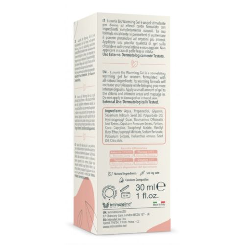 Luxuria BIO Warming gel 30 мл - це стимулюючий жіночий гель, що зігріває, створений на основі повністю натуральних інгредієнтів. Його інноваційна органічна формула використовує рослинні екстракти для зігрівання інтимних частин, що підвищує чутливість і підсилює стимуляцію, збільшуючи задоволення і приносячи вам більш інтенсивні оргазми. Завдяки своїй спеціалізованій формулі Luxuria BIO Warming збільшує приплив крові, стимулювання. Цей гель підходить всім жінкам, які бажають випробувати підвищене сексуальне задоволення. Luxuria BIO Warming діє, стимулюючи приплив крові до клітора та вагінальної області. При нанесенні на клітор і піхву він справляє лоскочучий і зігріваючий ефект, який підвищує чутливість, що призводить до більш інтенсивних оргазмів. Luxuria BIO Waeming та Cooling не містять агресивних для шкіри інгредієнтів. До їх складу входять тільки натуральні інгредієнти найвищої якості, які не завдають шкоди здоров'ю організму, зберігаючи при цьому дуже сильні змащувальні властивості. Нанесіть невелику кількість Luxuria BIO Warming на клітор та інтимні зони, ніжно масажуючи. Склад: вода, пропандіол, гліцерин, олія насіння кунжуту (Sesamum Indicum), полісорбат-20, гідроксипропілгуар, ізопропілміристат, екстракт листя розмарину лікарського, бензоат натрію, токоферолу ацетат, парфум (ароматизатор), сорбат калію соняшнику (Helianthus Annuus), екстракт плодів перцю перцю (Capsicum Annuum), ванілілбутиловий ефір, евгенол, лимонен, циннамал. Оргазм - це фізіологічна та психологічна реакція, яка зазвичай відбувається під час сексуальної стимуляції та супроводжується задоволенням та сексуальним збудженням. У кожної людини відчуття під час оргазму можуть бути індивідуальними, але загалом оргазм характеризується скороченням м'язів тазового дна, пульсацією та хвилею приємних відчуттів. Важливо розуміти, що оргазм - це не обов'язкова або єдина мета сексуального досвіду, і кожна людина може відчувати різні рівні сексуального задоволення. Якщо у вас виникають питання, занепокоєння або проблеми в сексуальній сфері, рекомендується обговорити їх з партнером або звернутися до професіоналів, таких як сексолог або терапевт, щоб отримати відповідну підтримку та керівництво. З роками вона поступово зарекомендувала себе як провідна компанія в секторі інтимного догляду та благополуччя, і з того часу почала розповсюджувати свою власну лінію ексклюзивних продуктів по всьому світу. Італія. З 1998 року компанія значно розширила власний асортимент продукції. На додаток до асортименту інтимних мастил (на водній, масляній та силіконовій основі) компанія представила ряд підсилювачів сексуальності (для нього і для неї) та ряд есенцій-афродизіаків, що перетворюють інтимні контакти на все більш унікальні переживання. З того часу компанія перенесла свою адміністративну штаб-квартиру в Лондон, столицю Великобританії та будинок Modern LifeStyle, але її виробничий майданчик залишився в Італії і продовжує працювати відповідно до найсуворіших стандартів якості, що органічно поєднуються з усією пристрастю та оригінальністю. те, що зроблено в Італії. Всі продукти IntimateLine з лінійки Sensual Cosmetics пройшли дерматологічні випробування, гіпоалергенні та строго розроблені відповідно до норм CE та стандартів IFRA. Про них регулярно повідомляється Міністерство охорони здоров'я і вони повністю відповідають усім законам Європейського Союзу