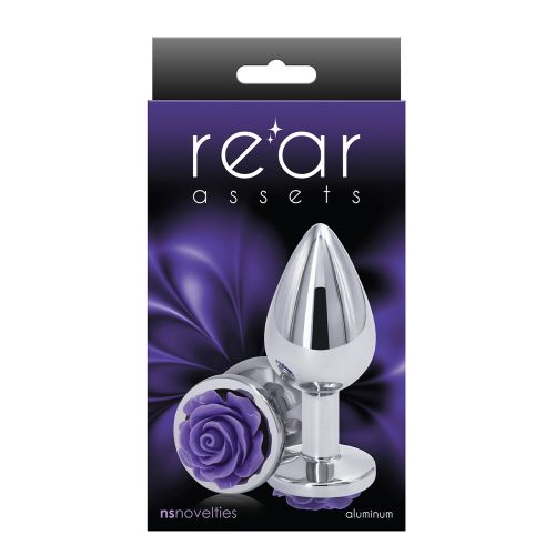 Анальний металевий затор сріблястого кольору з фіолетовою трояндою в основі NS Novelties Rose medium