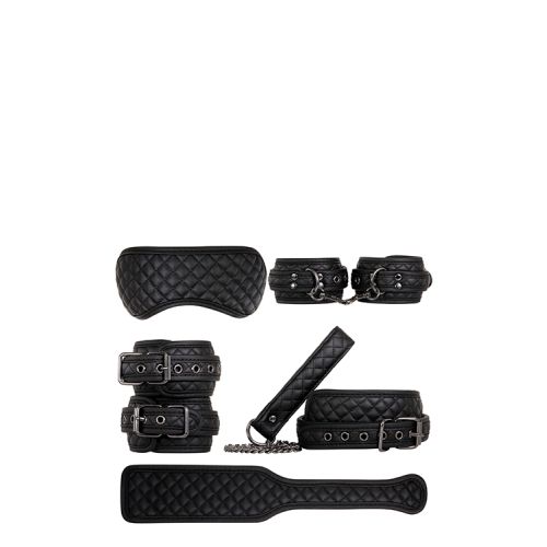 - В комплект входять: манжети на кісточки, манжети на зап'ястя, паддл, пов'язка на очі, нашийник та повідець.