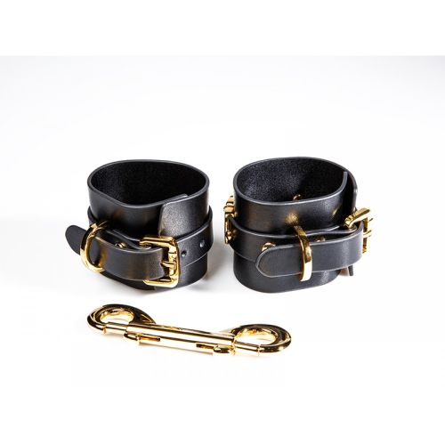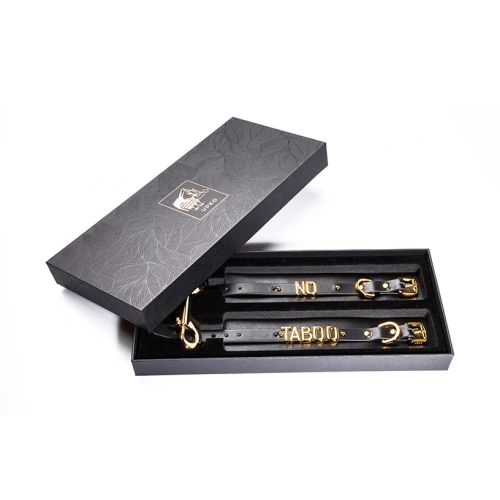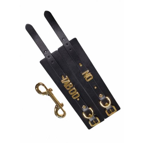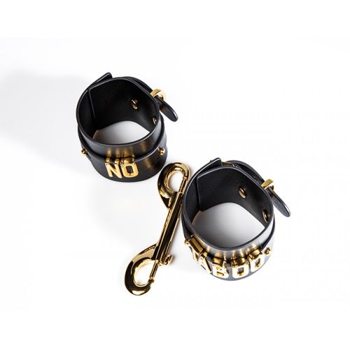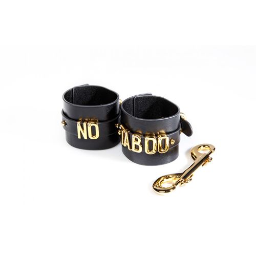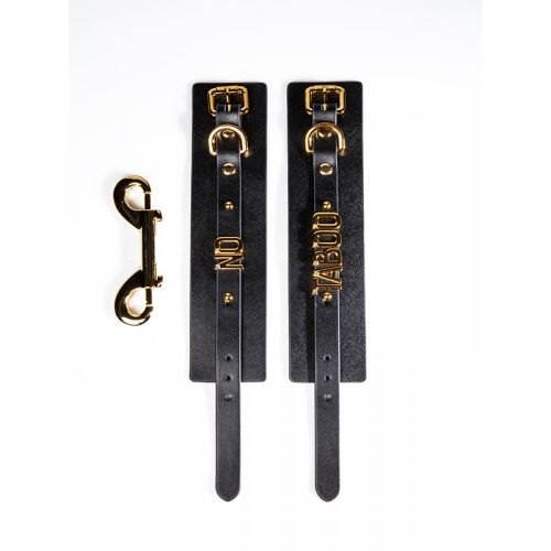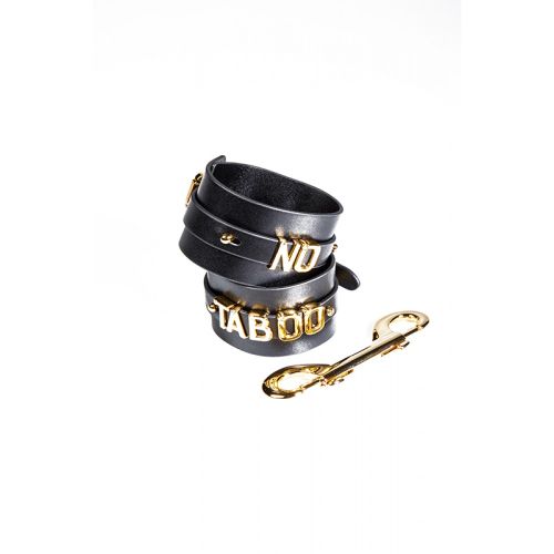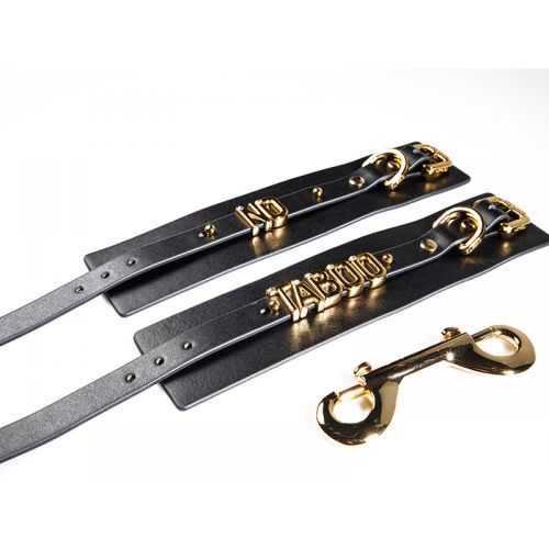Наручники із золотистою фурнітурою та написом Nо Taboo БДСМ з італійської шкіри чорного кольору Upko