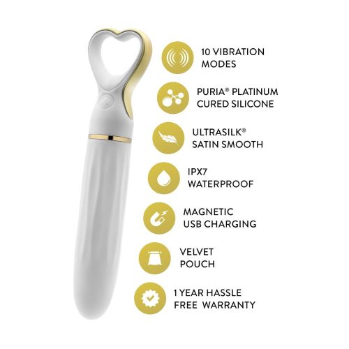 Іграшка виготовлена з преміального матеріалу Puria — платиново-відпаленого силікону з розкішним покриттям UltraSilk, яке робить поверхню особливо ніжною та оксамитовою. Ергономічна ручка у формі серця із золотистими деталями надає пристрою вишуканий і стильний вигляд. Вібратор водонепроникний за стандартом IPX7, тому ним можна насолоджуватися навіть у душі. Зручна магнітна USB-зарядка забезпечує просте та швидке поповнення енергії, дозволяючи Heartthrob завжди бути готовим до нових експериментів. Ідеально підходить як для новачків, так і для досвідчених користувачів, які прагнуть до нових висот насолоди.