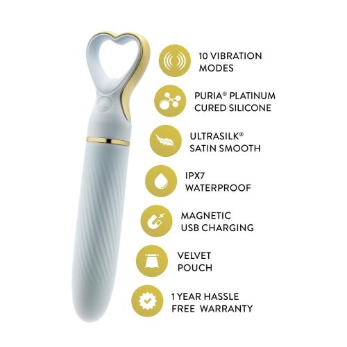 Вібратор виготовлений з високоякісного силікону Puria з оксамитовим покриттям UltraSilk, яке робить дотики особливо м'якими та приємними. Зручна ручка у формі серця із золотистими акцентами додає елегантності та робить використання ще комфортнішим. Heartthrob повністю водонепроникний (IPX7), що дає можливість використовувати його в душі, а магнітна USB-зарядка гарантує легке та швидке поповнення заряду, щоб він завжди був готовий до нових насолод. Дозвольте собі насолоджуватися кожною секундою з цим чудовим пристроєм.
