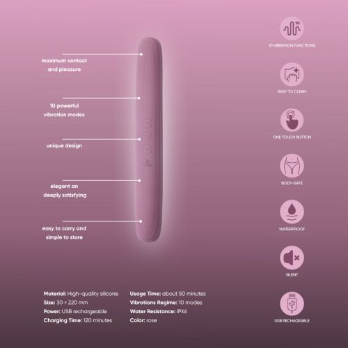 Цей вишуканий аксесуар має рівну форму, виготовлену з гнучкого і м'якого силікону. Поверхня прикрашена легким рельєфом, що створює додаткові відчуття при кожному дотику. Основна перевага цього вібратора – різноманітність можливостей. Він пропонує 10 різних режимів вібрації, щоб ви могли вибрати той, який ідеально відповідає вашим бажанням та настрою.