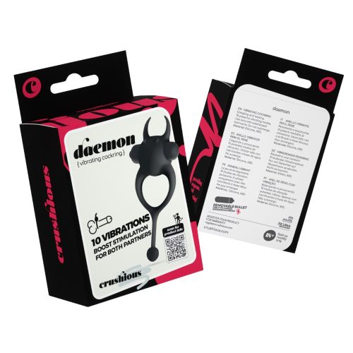 Daemon – ідеальне кільце для пікантних сеансів! Його диявольська форма створена, щоб дражнити партнера. Кільце, що вібрує, підходить як для гри удвох, так і для інтимних сеансів поодинці. М'яке та бархатисте на дотик, виготовлене з безпечного для тіла силікону, нешкідливе для організму і не містить фталатів. Захищене від бризок, ідеальне для гарячого душу.