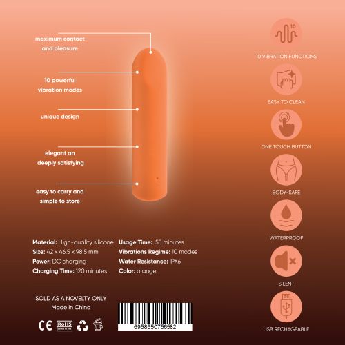 Модель пропонує десять режимів вібрації, що дозволяє змінювати інтенсивність та ритм відповідно до особистих уподобань. Бризгозахищений корпус допомагає використовувати пристрій без зайвих турбот, а тихий механізм забезпечує делікатну роботу. Керування здійснюється однією кнопкою, тому перемикання режимів залишається простим та зрозумілим. Заряджання відбувається через USB-кабель: повний цикл займає близько двох годин, після чого пристрій може працювати до 55 хвилин без заряджання.