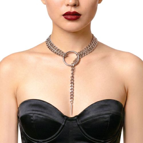 Эффектное украшение с массивной цепью и центральным кольцом создает сильный акцент и притягивает внимание с первого взгляда. Длинная подвеска визуально вытягивает силуэт и подчеркивает линию декольте.