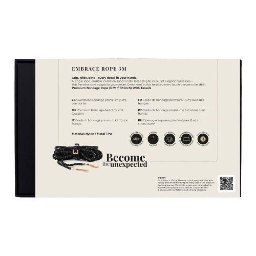 Embrace Rope 3M — универсальная веревка для элегантного БДСМ-связывания и творческих игр. Ее длина 3 метра позволяет использовать веревку для связывания рук, ног, создания начальных грудных шлей или декоративных, художественных техник. Мягкий и гибкий материал обеспечивает надежное удержание, при этом бережно воздействует на кожу, что делает ее комфортной как для коротких, так и длительных сессий. Гладкая текстура облегчает контроль узлов и делает веревку доступной как для новичков, так и для опытных пользователей. Золотые кисточки и застежка-ремень придают аксессуару изящество и обеспечивают удобное хранение без запутывания.